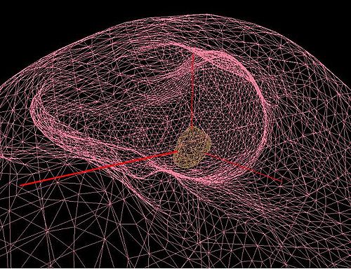 On arrive enfin à représenter le foie. Pour celà donc, nous avons utilisé les VBO afin d'aboutir à ce résultat. La prochaine étape est de représenter la tumeur et le foie en même temps. Nous avons créé une classe tumeur qui s'occupe du chargement et de l'affichage de la tumeur. Nous arrivons maintenant à afficher le foie et la tumeur en même temps. Cependant, vu que la tumeur se trouve à l'intérieur du foie, nous allons changer l'affichage du foie de tel sorte que l'on voit que les traits reliant les triangles sans couleur ni texture. On affiche désormais le foie et la tumeur ensemble avec pour le foie juste des traits pour avoir une meilleure vision de la position de la tumeur.