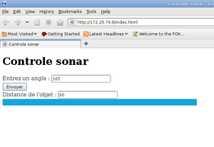 - La distance captée s'affiche sous forme d'une barre sur la page web. On a testé l'affichage en 2 dimensions (en tenant compte de l'angle fourni au moteur) mais on n'arrive pas à récupérer correctement la valeur de l'angle et à l'utiliser, il faudrait modifier les scripts cgi pour que les 2 informations (angle et distance) soient traitées par le même script.