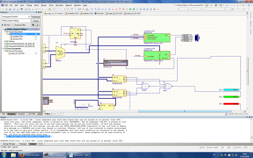 Nous avons commencé par rajouter le composant du port RS232 qui permettra d'envoyer et recevoir des données par liaison série. Nous avons également ajouté deux modules récupérés auprès des encadrants, un d'émission et un de réception. Une erreur liée à l'horloge de l'un de ces modules revient assez fréquemment, mais une fois tue n'empêche pas le fonctionnement normal du programme. Pour la transformer en avertissement et permettre la compilation, nous nous sommes servi du descriptif de l'erreur : il suffit d'ajouter manuellement une ligne de code (NET "RS_RX" CLOCK_DEDICATED_ROUTE = FALSE;) dans les fichiers .ucf du projet et de recompiler à partir de là où il y avait eu l'erreur. Malheureusement cette étape est à refaire à chaque nouvelle compilation du projet.