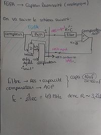 La FPGA nous permettra de contrôler l'intensité de la led à l'aide de la photorésistance. Pour cela, nous allons implémenté sur la FPGA dans un premier temps, le capteur et PWM qui sortira 1 ou 0, qui sera lié à un filtre passe bas, suivi d'un AOP qui renverra la valeur de la photorésistance, que l'on récupérera sur la FPGA et cela réglera donc l'intensité des néopixels.