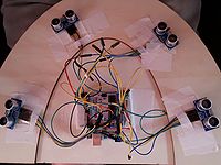 Arduino : câblage des 4 ultrasons sur un shield de prototypage. Après de nombreux débug nous avons découvert qu'un des 5 capteurs était mort et que la breadboard que nous utilisions comportait des faux contacts. Ces deux éléments ont donc été changés.