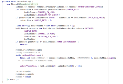 Nous avons donc passé une grande partie de la semaine à codé ceci, et vers la fin de la semaine, nous avons commencé à avoir des résultat satisfaisant. La méthode RecordAudio ainsi que le Timer s'active lorsque l'utilisateur appuie sur le bouton acitvierVibration de l'activité principale. Pour ne pas ralentir l'application ou créer de Bug, il a fallu créer un nouveau Thread dans lequel lancer l'application RecordAudio. Nous avons passé un certain temps avant d'enfin pouvoir réussir à utiliser les threads dans notre application. Mais une fois cela assimilé, il ne restait plus qu'a initialisé un timer et nous avions notre audio qui fonctionnait ! créer un timer n'était pas une chose très complexe car un grand nombre de tutoriel existait sur internet, mais il est peut être intéressant de voir à quoi ressemble l'application RecordAudio :