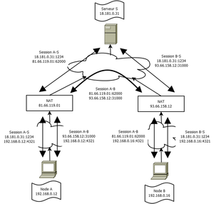 Pour le moment, nous choisissons la technique de communication en IPv4/UDP par UDP Hole Punching, on a schématisé sur la figure suivante le dispositif a mettre en place: