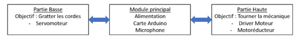 Notre objectif est donc de savoir gratter une corde, acquérir la fréquence qui en est émise à l'aide de notre capteur de vibration, puis grâce à notre algorithme, si la fréquence émise est supérieure à la fréquence de référence, le moteur tourne d'un sens pour tourner la mécanique, si la fréquence est inférieure, le moteur tourne dans l'autre sens. Nous devons donc travailler sur l'acquisition de la fréquence et le traitement du signal, et sur la modélisation 3D pour le boîtier, le rail et la pince.
