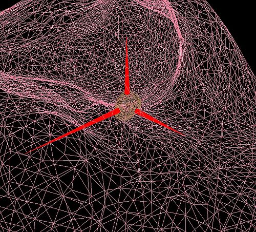 Nous avons grâce à ceci pu coder une méthode adaptée pour tester les triangles de la surface du foie et voir s'ils sont en intersection avec le rayon partant du barycentre de la tumeur et ayant pour vecteur directeur X, Y, ou Z. Une fois le bon triangle trouvé, la fonction se charge de renvoyer le point d'intersection, et il ne reste qu'a récupérer sa coordonnée en X,Y,ou Z (suivant le vecteur directeur précisé dans l'appel à la fonction) qui se trouve être la distance entre la tumeur et la surface du foie. Pour affiner un peu notre méthode, il faut d'abord l'appliquer à l'enveloppe de la tumeur elle même, puis faire de même avec la surface du foie, et soustraire les coordonnées obtenues pour les points d'intersections dans chacune des 3 direction afin d'obtenir une distance correcte pour chaque direction.