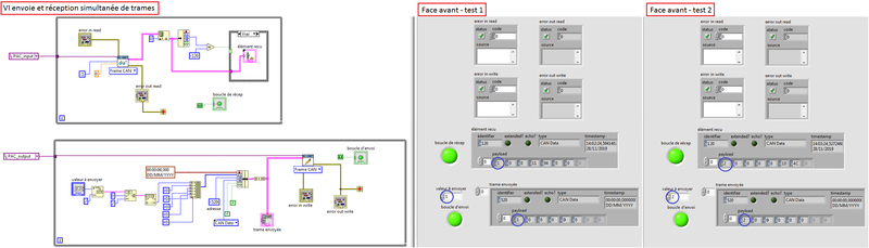 Nous avons travaillé sur l'envoi et la réception de trames sur le même VI. Un problème de configuration des clusters utilisés nous a ralenti, mais finalement avec deux sessions (une pour la lecture, une pour l'écriture) utilisant le même fichier cluster, il n'y a aucun problème.
