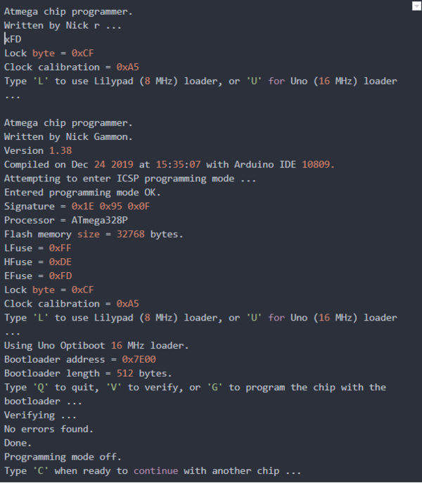 Suite à la soutenance et en accord avec Mr Chevalier, j'ai poursuivi le projet afin de réaliser les différentes parties non finalisées. J'ai donc commencé par changer la pin de connexion de l'horloge (passant de XTAL2 à XTAL1). Suite à cela le bootloader a semblé s'opérer avec succès. Le programme utilisé lors de cette opération est le suivant : lien bootload ce programme a pour avantage de vérifier les résultats du bootload afin de s'assurer de la réussite de l'installation.