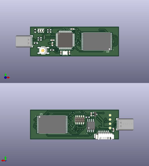 La première version de la clé usb (type C) est équipée d'un Atmega32u4, elle a la capacité d'accueillir deux puces NAND d'une capacité jusqu'à 8Go chacune. La carte expose aussi les points de tests pour utiliser un cable usb 2.0 dans le cas d'un problème avec l'USB type C, trois LEDs (dont une uniquement pour signaler le status alimenté et deux contrôlables directement par le microcontrôleur), un bornier pour l'ISP (ne sera pas soudé par défaut) et d'un bornier pour du JTAG (ne sera pas soudé non plus par défaut). J'aurais aimé aussi inclure une sortie UART pour servir de console durant la phase de développement, cependant tous les pins sont utilisés sauf un.