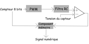 L'idée est désormais de modifier le rapport cyclique de la PWM via un compteur, cela nous permettra d'avoir un signal avec un rapport cyclique croissant. Ensuite, il nous faudra créer un signal de rampe en filtrant le signal de la PWM, la valeur moyenne de ce signal de rampe sera directement liée à la commande numérique correspondante. Enfin, il nous suffira de comparer cette tension avec celle de capteur : dès lors que les deux tensions sont égales, cela veut dire que le signal numérique de la PWM correspond à celui du capteur. Il nous suffira de récupérer ce signal numérique pour obtenir le signal analogique converti.