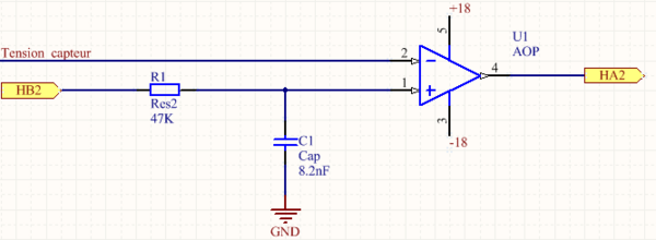 Nous allons désormais filtrer le signal PWM (port HB2) afin d'obtenir un signal de rampe, pour cela nous utiliserons un simple filtre RC passe bas. Ensuite, nous devrons comparer la valeur moyenne de ce signal avec la tension du capteur de pression pour obtenir le résultat de la comparaison sur le port HA2 (nous avons songé à utiliser un AOP en comparateur). Cela nous permettra de récupérer la valeur numérique directement visible sur les ports de sortie via le FD8B qui va enregistrer les 8 bits correspondant au signal analogique dès que la tension PWM filtrée sera égale à la tension du capteur.