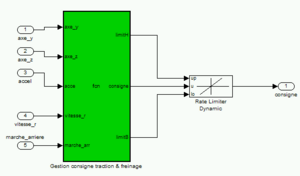 On peut donc constater qu'à l’origine un bloc de code Matlab traite les données des axes de pédales(axes_y/z), du rapport de vitesse choisi(intelligemment nommé "acce"), de la vitesse réelle et de l’activation ou non de la MAr. On retrouve en sortie une consigne accompagné de limites haute et basse passés à un "Rate Limiter Dynamic", qui va se rapprocher de la consigne pas à pas en fonction de l’état précédent et des limites hautes et basses. Ce bloc à l'avantage d’éviter les saut de de consigne sur les moteurs, mais aucune modification des limites haute et basse n'a été prévu lors d'une MAr. Une fois de plus la modification fut rapide (quelques if/end supplémentaires), le plus laborieux étant d'identifier la cause du problème.