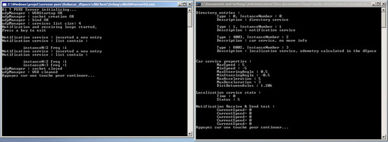 Révision datée du 10 février 2016 à 14:19 par Jtournie (discussion | contributions) (Projet P25 2015 Test du serveur PURE en local, Serveur à gauche Client à droite. Appel au Directory (GET et QUERY) puis à Car (GET et abonnement notif) et enfin à Localization (GET et abonnement notif). Pour terminer 5 échange de notifs entrante / s)