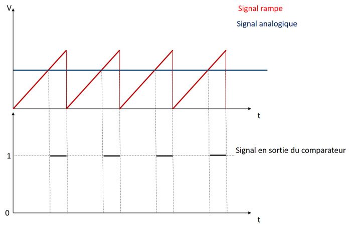 Voici en principe comment devrait fonctionner la conversion. Nous utilisons un compteur qui s'incrémente à une fréquence donnée et est remis à zéro quand le comparateur passe à 1. Nous sauvegardons la valeur du compteur à ce moment là.