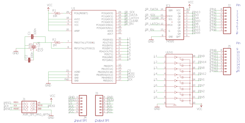 La première version schématique comprend le microcontrôleur pilotant les deux registres à décalage. Il présente également le montage "oscillateur à quartz". Il montre aussi l'envoi des données vers les différents ports de la matrice leds. Cependant, les connecteurs spi (entrée et sortie) ne sont pas représentés schématiquement, il faudra insérer les empreintes ou les créer si le montage est validé.