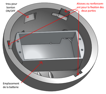 Après réflexion, nous avons décidé de faire deux parties pour la balle, nous assemblerons ensuite ces deux parties via un système de clips. La partie basse de la balle devra contenir le PCB, la bobine à induction ainsi que 3 vibreurs tandis que la partie haute aura la batterie et les trois dernier vibreurs.