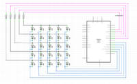 > La première solution nécessite 5 résistances, 25 leds et occupe 10 pins de l'arduino. 5 pins servent à contrôler chaque ligne (en rose sur l'image), et les 5 autres les colonnes (en bleu).