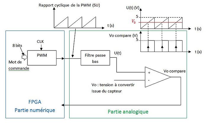 La conversion analogique-numérique développée dans ce projet est basée sur la génération de signaux PWM (Pulse Width Modulation, ou Modulation de Largeur d'Impulsions) puis par leur filtrage (filtre passe-bas) permettant d'obtenir une tension continue variable représentant la valeur numérique.