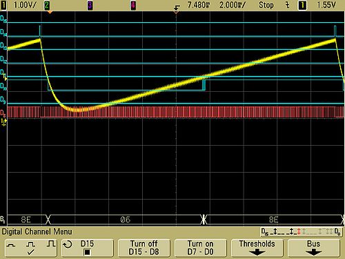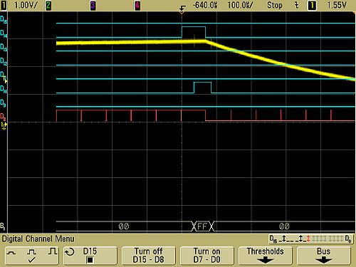 Et en blanc le bus avec le résultat de la CAN visible juste après un front mont montant sur V_0 compare (ici D10)