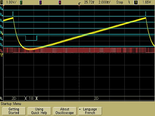 Lorsque la valeur moyenne du signal PWM devient supérieure ou égale à la tension du composant, la sortie du comparateur passe à +Vcc. À ce moment-là, la donnée de commande correspond à la représentation numérique de la tension du composant (conversion analogique-numérique).