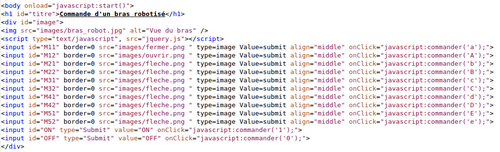 - Création d'un fichier HTML commande_bras_robot.html afin de commencer à créer l'interface Web pour la gestion du robot : création de boutons et des commandes associées,