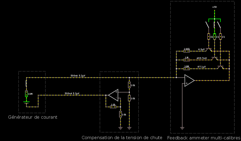 Le principe se rapproche d'une mesure par résistance de shunt, à cela on ajoute un AOP afin d'annuler la tension de chute (Voir une explication plus détaillée sur blog.freesideatlanta.org ou le Low Level Measurements Handbook de LLM handbook, page 1-18).