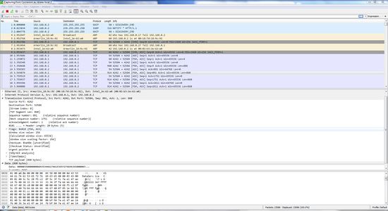 Sur l'image de gauche ci-dessous on peut observer les trames de connexion entre le panel PC et l'ordinateur à distance (en gris). Sur celle de droite on peut voir un exemple de trame de données envoyé du panel pc à l'ordinateur à distance.